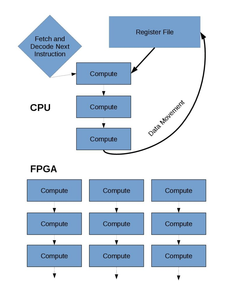 Picture a chip as a grid in which each square represents some process that can be applied to data. For a CPU or GPU, the data goes to a square to complete the process, then back to the beginning – to the register file – and then to a different square, back to the beginning after that, and so on. With an FPGA, it’s more like hopscotch, with the computation starting at the beginning, then hopping to one square and then another. “You move across the grid, going directly from one thing you want to do to another, and that’s more efficient,” Finkel explains. The data move from square to square with the program, instead of the CPU/GPU way of beginning, square, beginning, another square, beginning. “You’re not doing as much data movement with an FPGA, and that provides a big efficiency gain.”