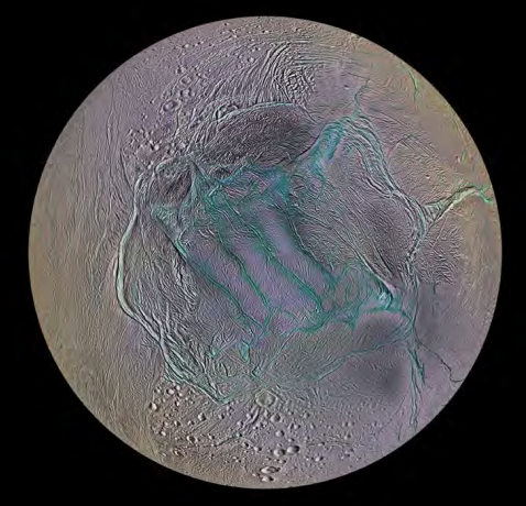 A color map centered on Enceladus’ south pole, as seen from NASA’s Cassini spacecraft. The tiger stripes are the central bluish lines. (Image: NASA/JPL-Caltech/Space Science Institute/Lunar and Planetary Institute.)